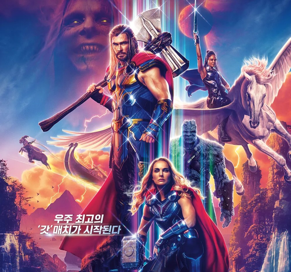 *토르: 러브 앤 썬더(Thor: Love and Thunder, 2022)*는 마블 시네마틱 유니버스(MCU)의 네 번째 토르 솔로 영화로, **토르(크리스 헴스워스)**가 다시 한번 신으로서의 사명을 깨닫고, **제인 포스터(나탈리 포트만)**와 재회하며, 신들을 위협하는 강력한 빌런 **고르(크리스찬 베일)**와 맞서 싸우는 이야기를 그립니다.